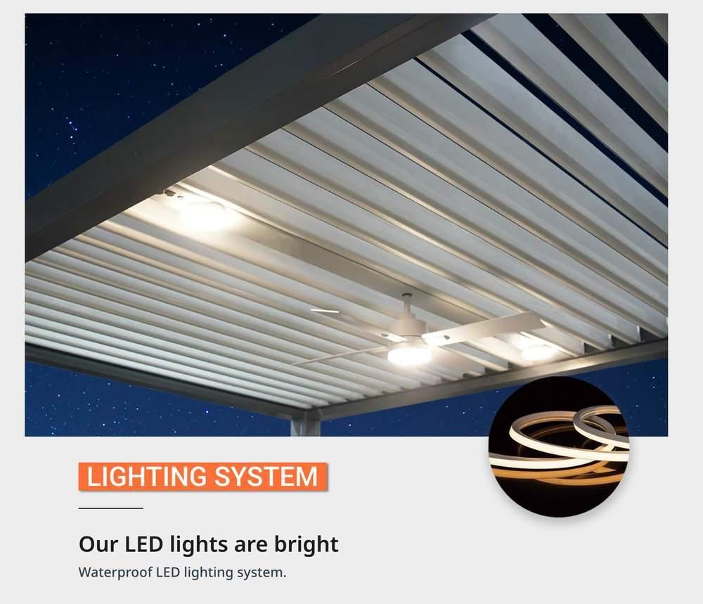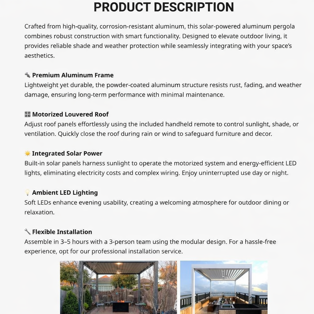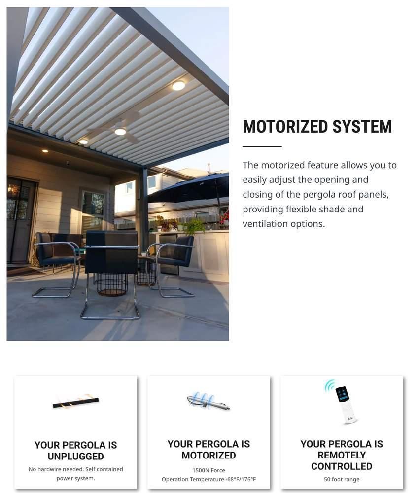 - Solar-powered motorized operation – no wiring required, integrates fans and lighting, is wireless, and energy-efficient