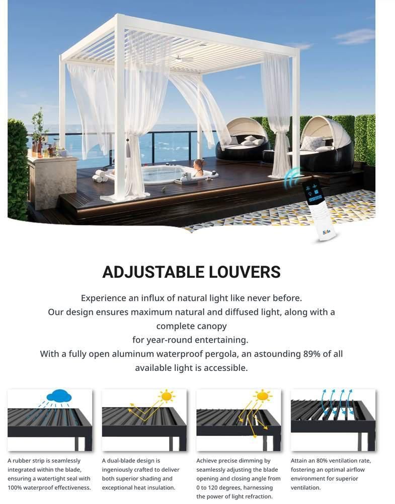- Adjustable louvers – control sunlight or close for rain protection